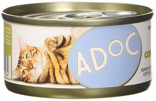 ADoC è un alimento di qualità realizzato con ingredienti naturali al 100%. Le parti migliori degli animali vengono scelte e cucinate a vapore per garantire il massimo dei nutrienti, con una percentuale di carne (in questo caso di pollo) superiore al 50% cui si aggiungono prosciutto, riso e varie vitamine.