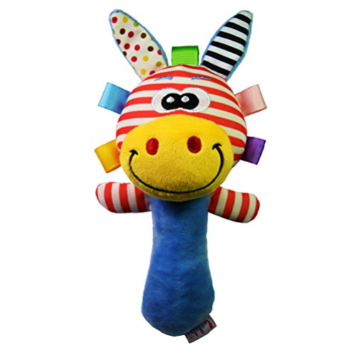 Una giraffa peluche che è anche un piccolo sonaglio, realizzata in cotone PP atossico e sicuro. I colori vivaci e l’aspetto simpatico attirano l’attenzione dei più piccoli, sviluppando la vista e l’udito, oltre che la loro manualità. Quando il bimbo lo spreme, il sonaglio emette un suono gradevole che desta molta sorpresa.