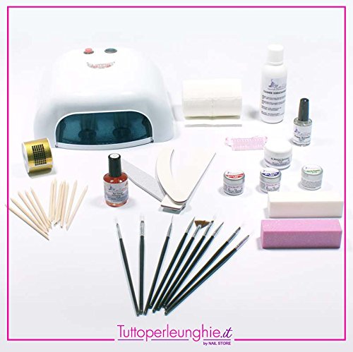 All’interno della confezione troverete la lampada UV da 36 W, tre barattolini di gel UV e un gel monofasico da 15 ml. Poi, un gel UV per french bianco da 15 ml e un gel UV da 5 ml che vi consentirà di nascondere le imperfezioni dell’unghia naturale e il distacco tra unghia naturale e parte ricostruita. Inoltre, ci sono tre barattoli di gel UV colorato da 5 ml, un primer da 15 ml e un cleaner da 100 ml, il quale sgrassa le unghie prima e dopo la ricostruzione. Trattandosi di un kit completo, il costo è abbastanza elevato e potrebbe non essere a portata di tutte le tasche.