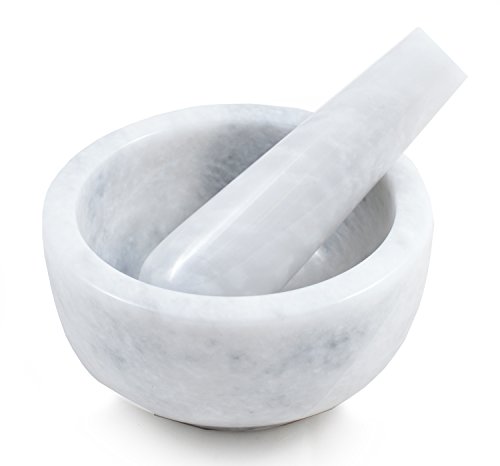 L’ultimo mortaio della nostra lista è realizzato in marmo bianco himalayano, dalle dimensioni esterne di circa 10 centimetri. Si tratta più di un oggetto di design che un mortaio rivolto a preparazioni complesse in cucina poiché il diametro interno è di 9 centimetri, eccessivamente piccolo secondo la maggior parte degli utenti.