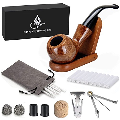 Il Joyoldelf ZBI-JJ159 è un kit di accessori per pipa che include venti scovolini, un curapipe 3 in 1, un alesatore, due sferette di maglia metallica, la basetta di sughero dove battere la pipa per caricarla bene, dieci filtri da 8 millimetri di diametro, due guarnizioni in gomma alimentare per l’estremità del bocchino, un sacchetto in stoffa con chiusura a cordoncini, una basetta pieghevole dove collocare la pipa tra una boccata e l’altra, nonché una pipa intagliata a mano in legno di mogano.
