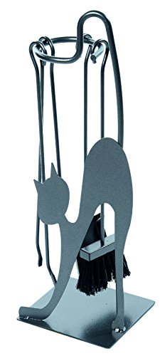 Gli attrezzi da camino di LaFerrotecnica sono accompagnati da un trespolo (dove poterli appoggiare) dalla forma singolare: la silhouette di un gatto con la schiena inarcata che poggia su una base quadrata.