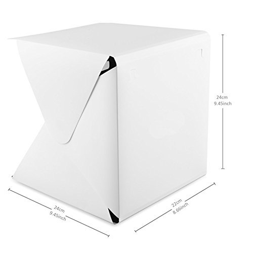 È un modello pieghevole che misura 24 x 22 x 2 centimetri quando è chiuso, e 24 x 22 x 24 centimetri quando è aperto, ed è realizzato in polipropilene, resistente e leggero, con una finitura opaca che impedisce alla luce di riflettersi e di creare fastidiosi aloni e flare; dispone anche di una striscia LED luminosa, per l’illuminazione autonoma dei soggetti da fotografare, e di uno sfondo bianco, inoltre la confezione include anche il cavo Micro USB per l’alimentazione della striscia LED.