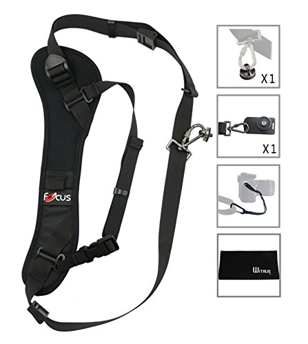 Il pregio principale del kit di supporto WITHLIN Focus 5, è la sua piastra di collegamento compatibile con la maggior parte delle fotocamere reflex disponibili attualmente; il kit include, ovviamente, anche la cinghia a tracolla, con cinturino ascellare, e il cinturino da polso.