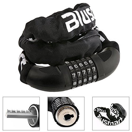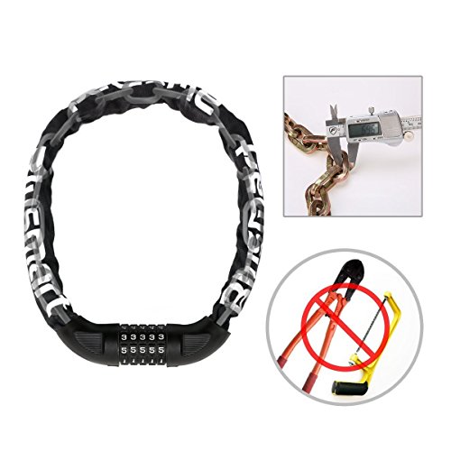Non c’è modo di scardinare la catena provando a indovinare la combinazione a cinque cifre perché le combinazioni possibili sono 100.000, mentre sono 10.000 con quattro cifre e 1.000 con tre cifre. Il problema sono le maglie della catena spesse circa 7 mm, niente che una tronchese non possa scassinare. Molto pratico e utile il rivestimento esterno che protegge la bici dai graffi e la catena dagli agenti atmosferici; se non sai come scegliere un buon antifurto per bicicletta economico, dagli un’occhiata.