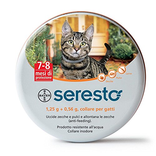 L’antiparassitario per gatti Seresto, prodotto da Bayer, è commercializzato sotto forma di collare; è realizzato con un’innovativa matrice polimerica che integra il principio attivo e lo rilascia in maniera controllata, a piccole dosi.