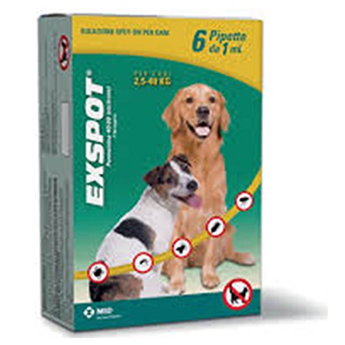 Anche l’antiparassitario Exspot, prodotto dalla ditta MSD, è in formato pipetta e la confezione ne contiene sei unità, ma da 1 ml ognuna; va utilizzato solamente per i cani e mai sui cuccioli di età inferiore alle due settimane.