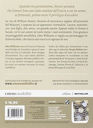 La storia di una vita, quella di William Stoner, con tutto il suo contorno di banalità, sofferenze e interrogativi. Un piccolo, grande libro, con il valore aggiunto della lettura di un attore del livello di Sergio Rubini.