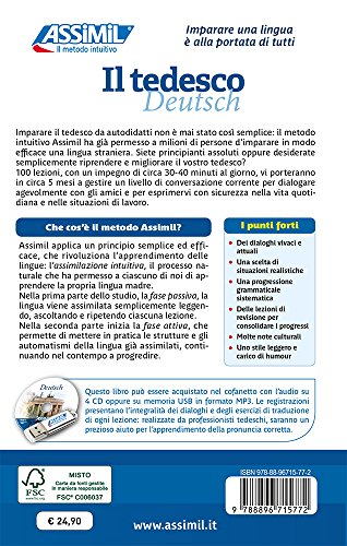 Il metodo Assimil rende semplice acquisire la lingua tedesca, tramite le due fasi, una di apprendimento passivo, in cui si legge e si ascolta, ripetendo poi i termini incontrati, e una attiva in cui si mette in pratica ciò che si è imparato. Si tratta in tutto di cento lezioni, da 30/40 minuti l’una.