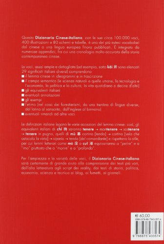 Contiene 190.000 tra voci e accezioni, suddivise nelle sezioni cinese-italiano e italiano-cinese, 73.000 tra esempi e frasi, la tavola delle chiavi, l’ordinamento alfabetico in base alla trascrizione pinyin, note e indicazioni per la corretta pronuncia, più di 200 note grammaticali cinesi e la segnalazione delle parole fondamentali italiane.