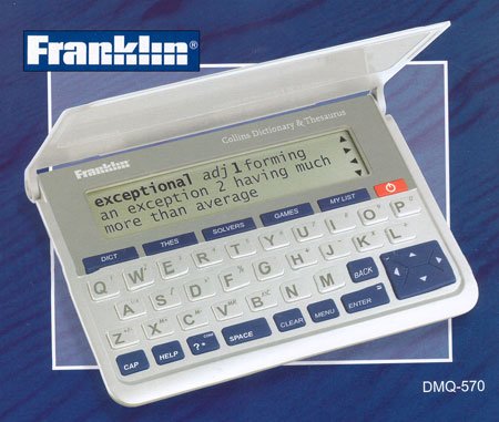 Il dizionario elettronico di Franklin è ideale per chi ha bisogno di ampliare la conoscenza della lingua inglese, visto che contiene 170000 frasi e parole, oltre a 500000 sinonimi. Può essere usato per correggere la pronuncia o anche per la soluzione di anagrammi e cruciverba.