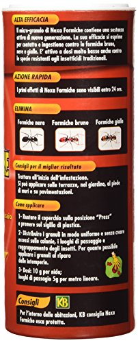 Un altro insetticida specifico destinato per lo più all’impiego agricolo è il NEXA Formiche, prodotto dalla ditta KB; si tratta di un composto a base di fipronil, un insetticida ad ampio spettro da usare contro gli insetti striscianti, in particolar modo le formiche.