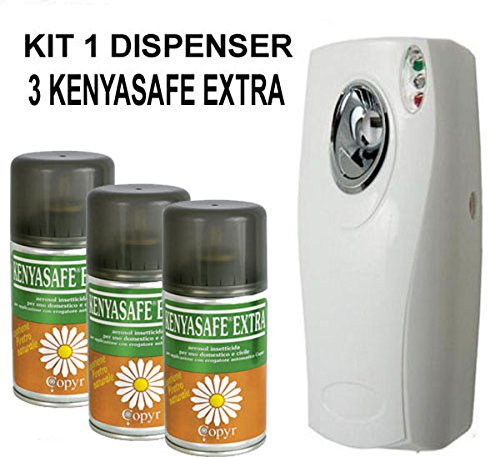 L’insetticida Kenyasafe Extra è una miscela a base di piretro e tetrametrina che ha la doppia valenza di repellente e insetticida al tempo stesso; è venduto in confezioni che includono tre bombolette spray da 250 ml e il relativo erogatore automatico.