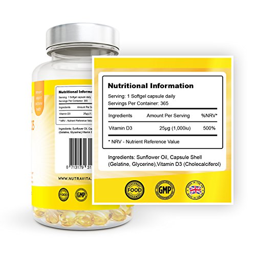 Nutravita: Vitamina D3 1.000 IU, Olio di Girasole, Rivestimento Vegetable Capsula (Gelatina, Vitamina D3, Glicerina), Vitamina D3 (Colecalciferolo).