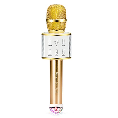 Si tratta di un microfono wireless dal forte impatto estetico, grazie al suo design moderno, ma soprattutto alla scelta dei colori: argento e viola con finitura metallizzata, inoltre dispone di un dispositivo luminoso multicolore; è il microfono ideale da regalare a una ragazzina.