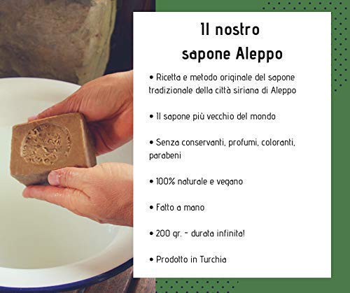 Un ottimo prodotto artigianale prodotto seguendo la ricetta tradizionale siriana. In particolare questo prodotto si presta bene a essere usato per la cura della pelle di tutto il corpo e del viso, anche dei capelli se poi si ha cura di frizionarli con aceto per rimuoverne tutte le tracce.