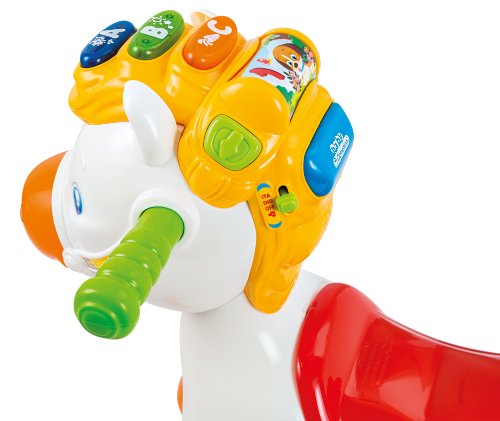 Un’altra utile funzione di questo cavallino cavalcabile è la possibilità di imparare lettere, numeri, nomi degli animali e anche l’inglese. Tutto schiacciando i tasti presenti sulla criniera.