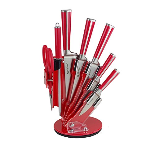 Quello di Alpina è un ceppo portacoltelli completo, in quanto include anche gli accessori. Consta in un supporto girevole, di colore rosso acceso, in plastica e acrilico, cinque coltelli di diverse dimensioni,delle forbici da cucina e un affilatore.