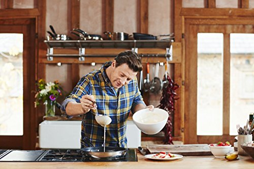 Esternamente l’acciaio è lucidato e rifinito in color argento, mentre la parte interna è dotata dello speciale rivestimento antiaderente a sei strati Tefal Prometal Pro in PTFE, un materiale inerte sicuro per l’uomo e per l’ambiente, usato anche in chirurgia per la creazione di vene artificiali. La padella Jamie Oliver, inoltre, è completamente priva di piombo, cadmio e PFOA.