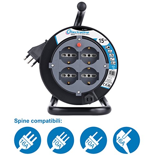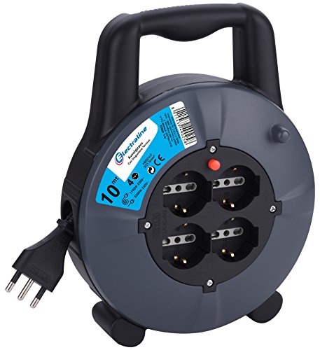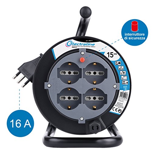 La prolunga Electraline 49127 è un modello dotato di avvolgicavo, quattro prese universali con protezioni di sicurezza per i bambini, e spina a tre pin da 16A, dispone inoltre di una protezione di sicurezza che scollega automaticamente l’alimentazione, nel caso in cui il carico di potenza superasse il limite di portata del cavo.
