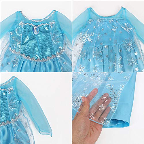 L’abito è realizzato in poliestere resistente e di alta qualità ed è dotato di maniche trasparenti e di una raffinata cappa in organza, decorata con fiocchi di neve, che aggiungono un tocco regale al travestimento. Il vestito è comodo e pratico da indossare e il tessuto è morbido e non irrita la pelle. Insieme al costume troverete una corona, una bacchetta magica e un paio di guanti, in maniera da arricchire e completare il personaggio.