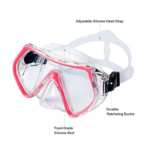 La maschera ha lenti in vetro temperato, prive di distacco, così da permette una visione più ampia del fondale marino. Inoltre sono molto robuste e non cederanno troppo facilmente qualora vi cadano a terra. La cinghia posteriore è morbida e facilmente regolabile, così da non tirare i capelli e non stringere troppo la testa.