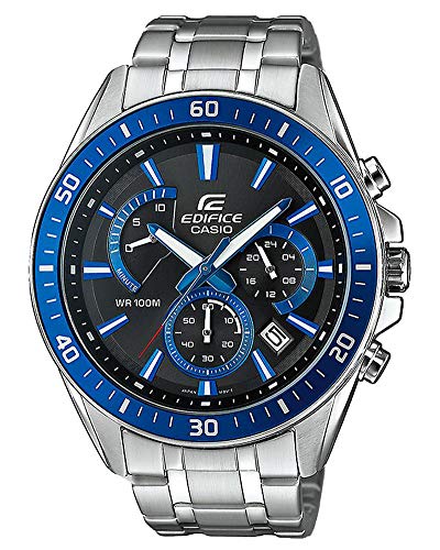 Appartenente alla famiglia di modelli Casio Edifice, questo orologio da polso è pensato per un uomo che apprezza lo stile piuttosto classico, senza rinunciare a un tocco di colore. Il modello si presenta infatti con cinturino e cassa in acciaio inox mentre la ghiera e alcuni elementi del quadrante sono blu elettrico, con numeri e inserti in bianco.