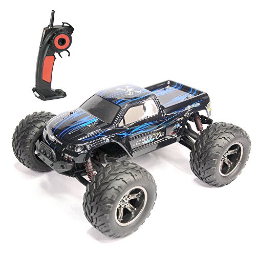 L’auto elettrica radiocomandata Vangold 9116C è un modello finito che non richiede montaggio, in scala 1:12, di tipo Monster Truck con ruote grandi adatte a correre anche su piste sterrate e bagnate.